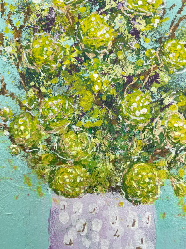 Using the prompts of ‘green’ I was enamored with discovering lime green chrysanthemums. An experiment of greens, in both cool and warm, captures the vibrancy of these mums.